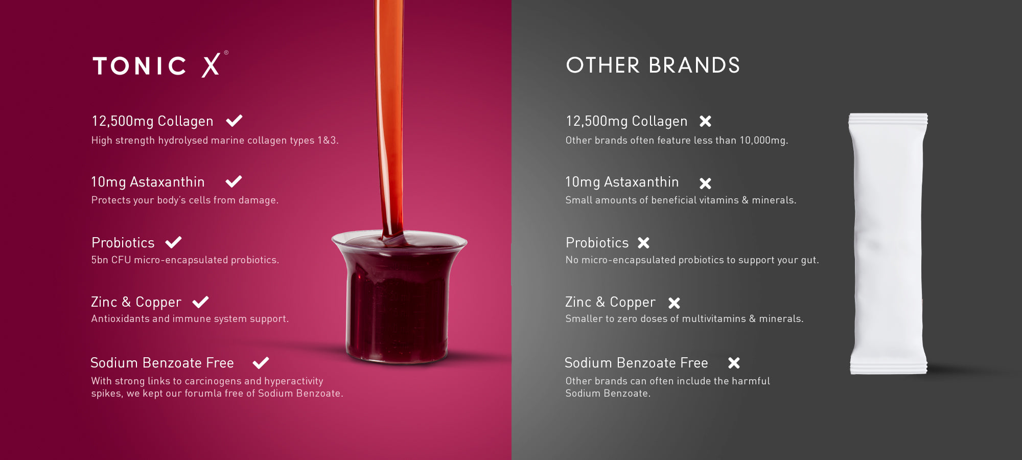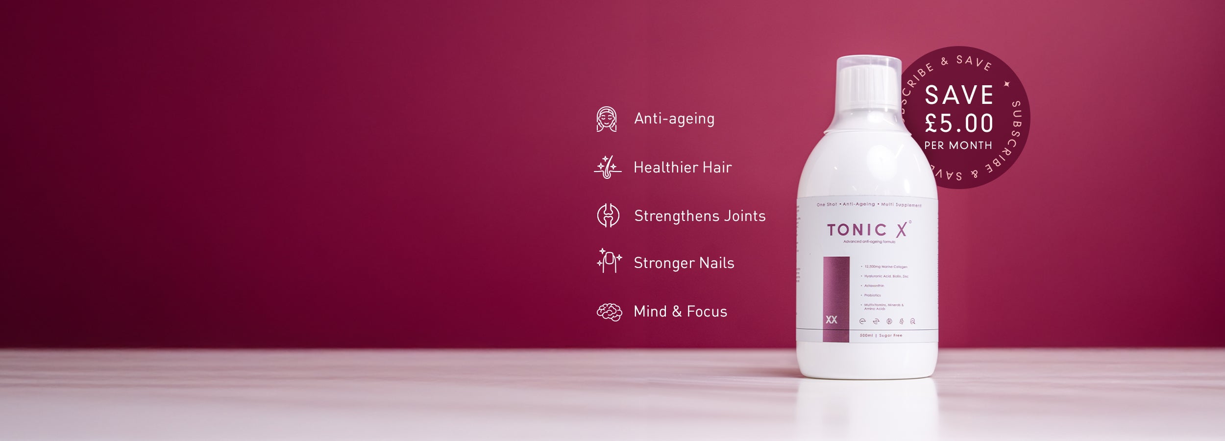 Tonic X is the only liquid supplement on the market to include the wonder antioxidant Astaxanthin along with Marine Collagen and the vitamins it needs for maximum efficacy. Not only this, Tonic X also includes micro encapsulated probiotics too!